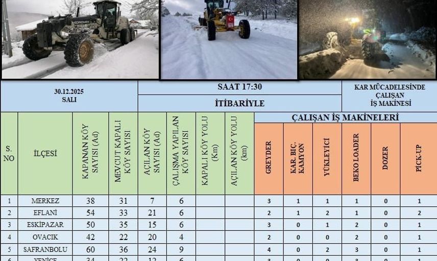 Karabük Valiliği tarafından yapılan açıklamada, "İl Özel İdaresi ekipleri, zorlu kış şartlarına rağmen vatandaşların güvenli ulaşımının sağlanması ve kırsalda günlük yaşamın aksamaması amacıyla il genelinde 7 gün 24 saat esasına göre çalışmalarını sürdürüyor" ifadelerine yer verildi.