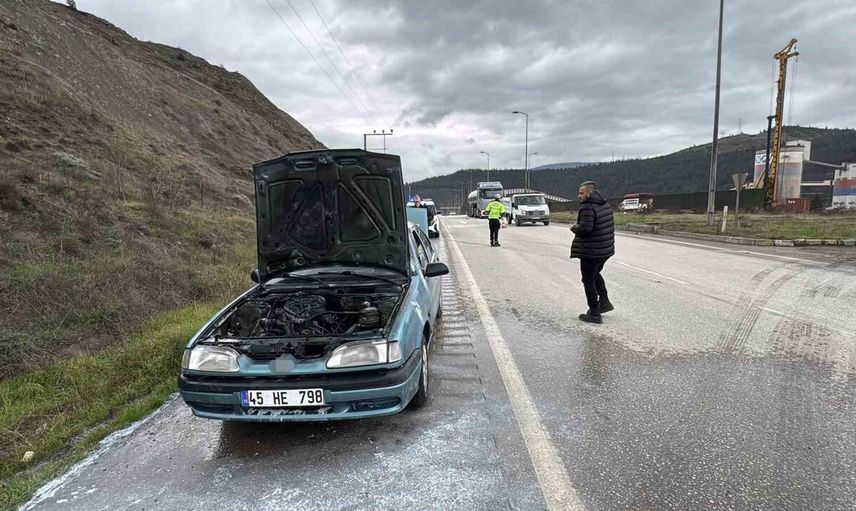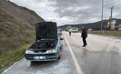 Karabük-Eskipazar kara yolu Asit Köprüsü mevkisinde seyir halindeyken motor kısmında alevler çıkan otomobil, sürücünün müdahalesi ve itfaiye ekiplerinin çalışmasıyla kontrol altına alındı.