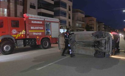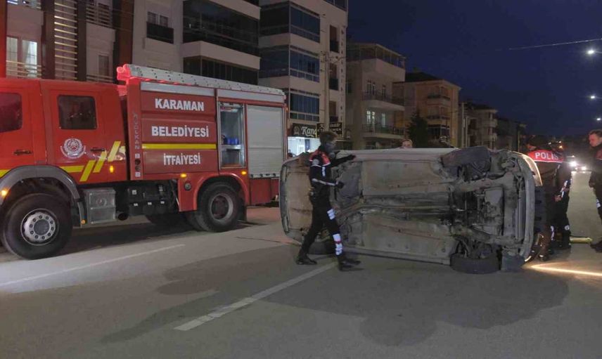 Karaman'da park halindeki araca çarpan otomobil devrildi