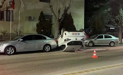 Karaman'da park halindeki araçlara çarpan otomobil ters döndü