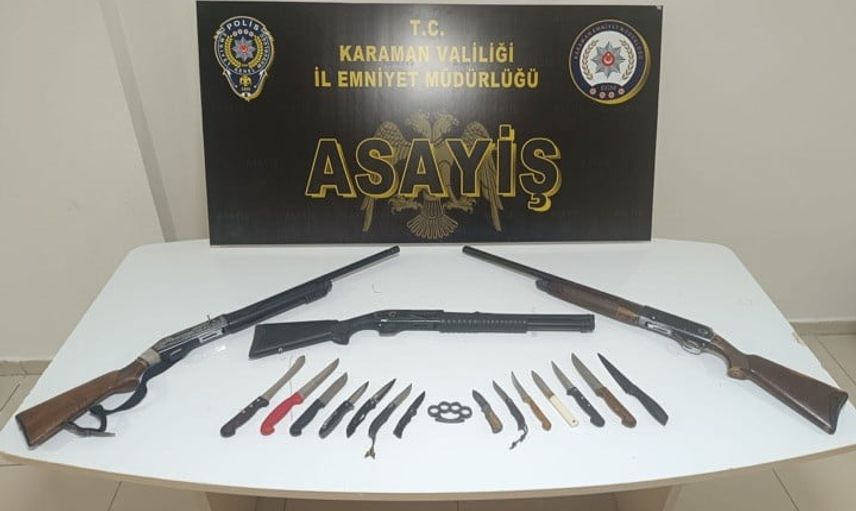 KARAMAN'DA POLİSİN YAPTIĞI UYGULAMALARDA RUHSATSIZ TÜFEKLER İLE UYUŞTURUCU VE KAÇAK TÜTÜN ELE GEÇİRİLİRKEN, ARANAN 3 ŞAHIS TUTUKLANDI.