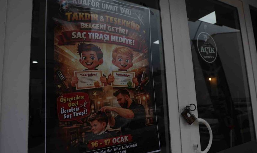 Elazığ'da erkek kuaförü Umut Diri, karne günü takdir ve teşekkür belgesi alan öğrencilere yönelik düzenlediği ücretsiz tıraş kampanyasıyla dikkat çekti. Uygulama iki gün sürdü ve öğrencilerden yoğun ilgi gördü.