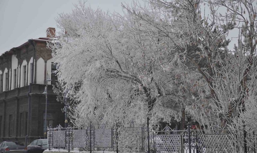 Hava sıcaklığının eksi 20 derece'ye kadar düştüğü Kars'ta, etkisini sürdüren Sibirya soğukları doğayı adeta dondurdu. Kent merkezi beyaza bürünürken, park ve bahçelerdeki ağaçlar kırağıyla kaplandı ve görsel bir şölen oluşturdu.