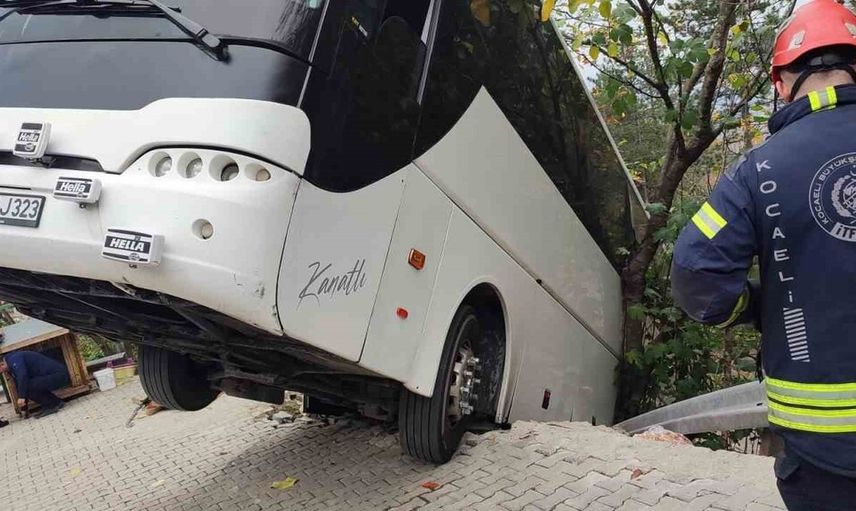 Otobüsün arka tekerlekleri toprak zemine değdi; ön kısmı havada asılı kaldı. İhbarın ardından bölgeye jandarma ve itfaiye ekipleri sevk edildi.