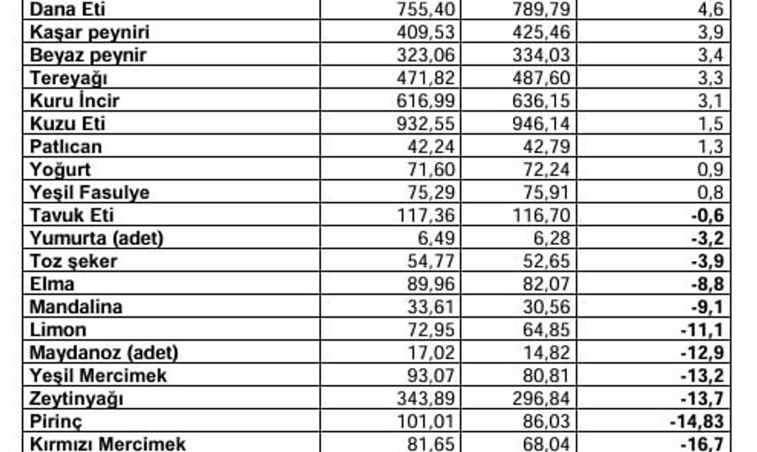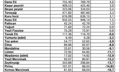 Markette fiyatı en fazla artan ürün yüzde 149,5 ile pırasa oldu. Pırasayı yüzde 118,3 ile ıspanak, yüzde 71,7 ile fındık ve yüzde 58,5 ile antep fıstığı takip etti. Markette fiyatı en çok azalan ürün ise yüzde 55 ile marul oldu; maruldaki düşüşü yüzde 46,6 ile portakal ve yüzde 43,3 ile kuru soğan izledi.