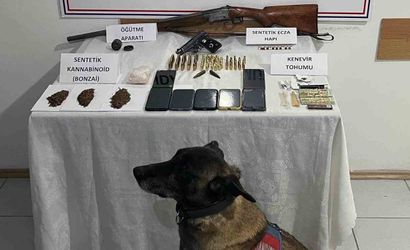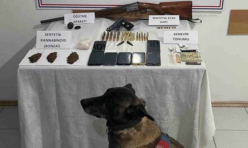 Aramalarda ele geçirilenler arasında: 57 gram sentetik kannabinoid katkılı tütün, 18 adet sentetik ecza hapı, 3 gram kenevir tohumu, 1 adet uyuşturucu madde öğütme aparatı, 19 adet kilitli poşet, 1 adet ruhsatsız tabanca, 70 adet tabanca fişeği, 1 adet ruhsatsız av tüfeği, 7 adet cep telefonu ve 7 adet SIM kart yer aldı.