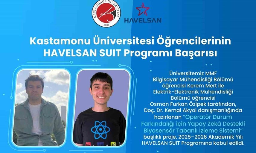 Kastamonu Üniversitesi öğrencileri tarafından hazırlanan "Operatör Durum Farkındalığı için Yapay Zeka Destekli Biyosensör Tabanlı İzleme Sistemi" başlıklı proje, 2025-2026 Akademik Yılı kapsamında HAVELSAN SUIT programına kabul edildi. Proje, Mühendislik ve Mimarlık Fakültesi Bilgisayar Mühendisliği öğrencisi Kerem Mert ile Elektrik-Elektronik Mühendisliği öğrencisi Osman Furkan Özipek tarafından, danışman Doç. Dr. Kemal Akyol yönetiminde hazırlandı.