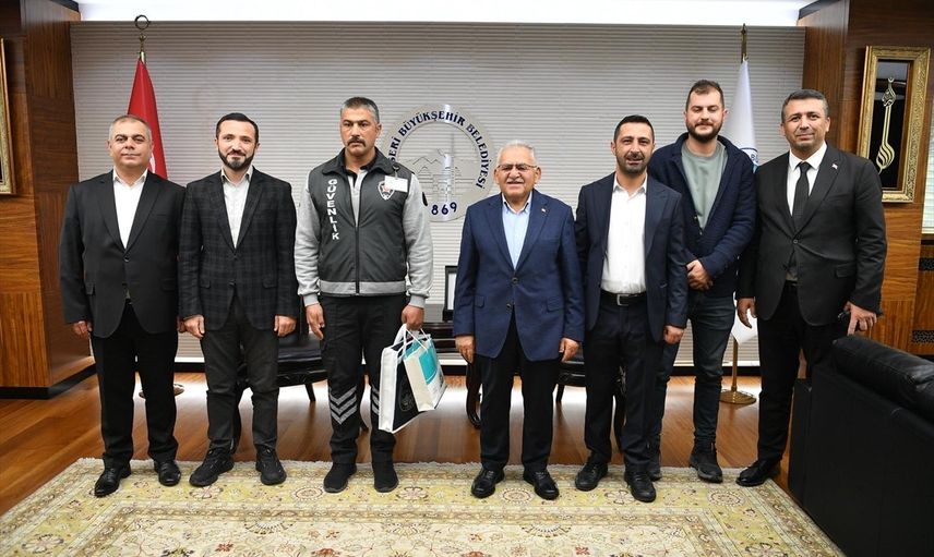 Kayseri'de karşı perona geçmeye çalışan kadın yolcuya tramvayın çarpmasını önleyen güvenlik görevlisi Ayhan Akkış (solda), Kayseri Büyükşehir Belediye Başkanı Memduh Büyükkılıç tarafından (sağda) "Teşekkür Belgesi" ile ödüllendirildi.