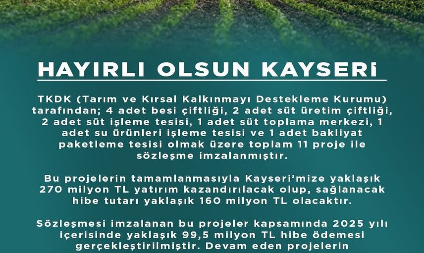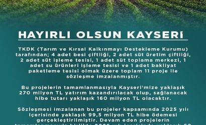 Sözleşme imzalanan projeler arasında 4 adet besi çiftliği, 2 adet süt üretim çiftliği, 2 adet süt işleme tesisi, 1 adet süt toplama merkezi, 1 adet su ürünleri işleme tesisi ve 1 adet bakliyat paketleme tesisi bulunuyor. Projelerin tamamlanmasıyla Kayseri’ye yaklaşık 270 milyon TL yatırım kazandırılacağı ve sağlanacak hibenin yaklaşık 160 milyon TL olacağı belirtildi.