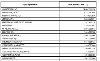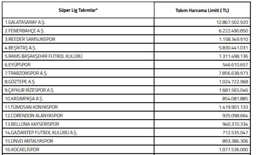 Açıklamaya göre ikinci transfer ve tescil döneminde en yüksek harcama limiti Galatasaray'a verilirken, en az limit Eyüpspor'a verildi.