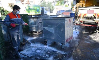 Kemer'de çöp konteynerleri sıcak ve ilaçlı suyla dezenfekte ediliyor