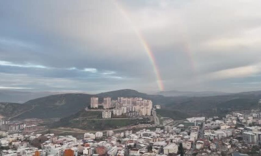 İlçe genelinde dikkat çeken olay, dronla da görüntülenerek kayıt altına alındı. Havadan çekilen görüntülerde gökkuşağının şehir silüeti üzerinde belirgin şekilde belirdiği görüldü.
