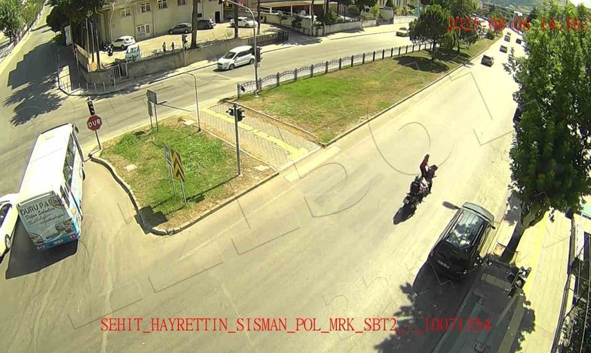 Mustafa Kemal Paşa Caddesi eski lise kavşağında, kaygan zeminde ilerleyen bir motosikletli önüne aniden çıkan otomobile hızla çarptı. Motosikletli adeta otomobilin kaputuna yapıştı ve kaskı başından fırladı. Kaza anı kameraya yansıdı.