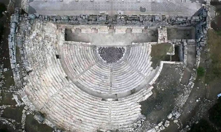 MS 1. yüzyılın ilk evrelerine tarihlenen bu eşsiz mozaik, mitolojide gözlerine bakanları taşa çeviren "yılan saçlı, keskin dişli" dişi canavar olarak bilinen Medusa figürünü betimliyor. Antik dönemde Odeon, konser, meclis, mahkeme ve üzeri kapalı tiyatro işlevleri gören bir yapı olarak ziyaretçilerin en çok ilgi gösterdiği alanlardan biri konumunda.