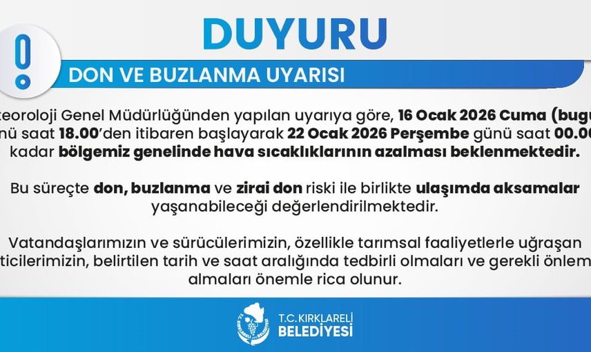 Meteoroloji Genel Müdürlüğü tarafından yapılan açıklamada, 16 Ocak 2026 Cuma günü saat 18.00’den itibaren sıcaklıklarda belirgin düşüş başlayacağı, soğuk etkinin 22 Ocak 2026 Perşembe günü saat 00.00’a kadar süreceğinin tahmin edildiği bildirildi. Bu süre zarfında özellikle gece ve sabah saatlerinde don ve buzlanma olaylarının görülebileceği vurgulandı.