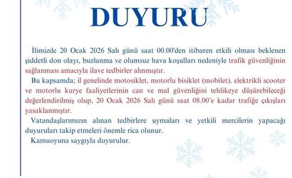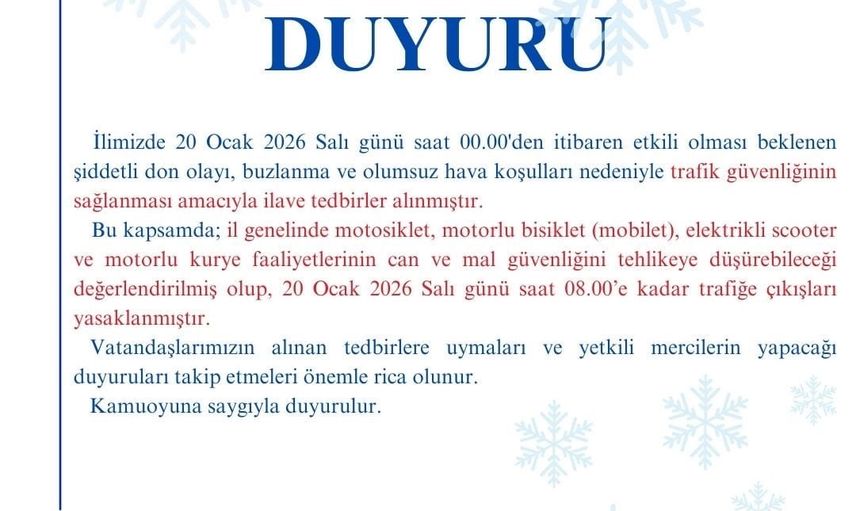 Valiliğin kararına göre özellikle motosiklet, scooter ve kurye sürücüleri için iki tekerlekli araçların trafiğe çıkışı 20 Ocak sabah saat 08.00’e kadar kısıtlandı. Yetkililer, uygulamanın kaza riskini azaltmayı amaçladığını duyurdu.