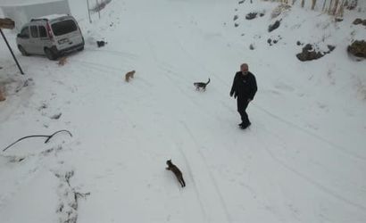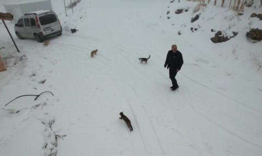 KÖYDEKİ KEDİ VE KÖPEKLERİ SOĞUK KIŞ GÜNLERİNDE AÇLIKTAN ÖLMEMELERİ İÇİN KENDİ ELLERİYLE BESLİYOR. ÇEVRE İLÇE VE BELDELERDEKİ FIRINLARDAN BAYAT EKMEKLERİ TOPLAYAN ALİ RIZA BİLDİK, BUNLARLA HAYVANLARI BESLİYOR. DİĞER KÖYLÜLER DE BAYAT EKMEK GETİREREK MUHTARA DESTEK OLUYOR. KEDİ VE KÖPEKLER, ELİNDE BAYAT EKMEK DOLU TORBAYI GÖRÜNCE MUHTAR BİLDİK'İN ETRAFINDA TOPLANIYOR.