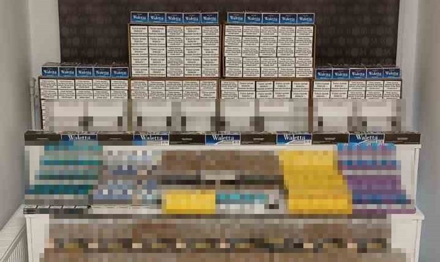 İkamet ve bir iş yerinde yapılan aramalarda 158 bin adet içi kıyılmış tütünle doldurulmuş makaron ile 588 paket bandrolsüz sigara ele geçirildi.