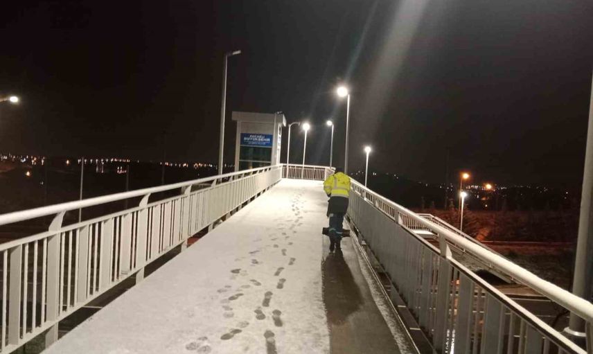 Dün gece yüksek kesimlerde etkisini artıran kar yağışına karşı harekete geçen ekipler; ana arterlerde, köprülerde, hastane girişlerinde ve durak önlerinde kar küreme ile tuzlama çalışması gerçekleştirdi.