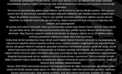 Kocasinan Şimşekspor Kulübü olarak Hakem Kurulu'ndan; Hakem Samet Armut'un bundan sonra kulübümüzün hiçbir resmi müsabakasında görevlendirilmemesini, saha içine ailevi veya kişisel meselelerin yansımadığı tarafsız ve adil hakemlerin atanmasını talep ediyoruz. Yönetim, adaletin ve sporun ruhuna uygun bir yönetim anlayışının tesis edilmesini beklediklerini bildirdi.