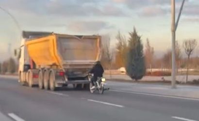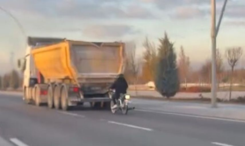 Konya'nın merkez Selçuklu ilçesi Büyükkayacık Mahallesi Ankara Caddesi üzerinde seyreden hafriyat taşıyan bir tırın arkasından giden motosiklet sürücüsünün tehlikeli hareketleri, başka bir araçta bulunan kişilerce kaydedildi.