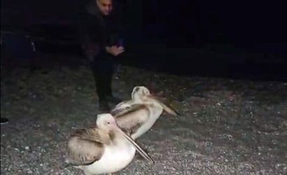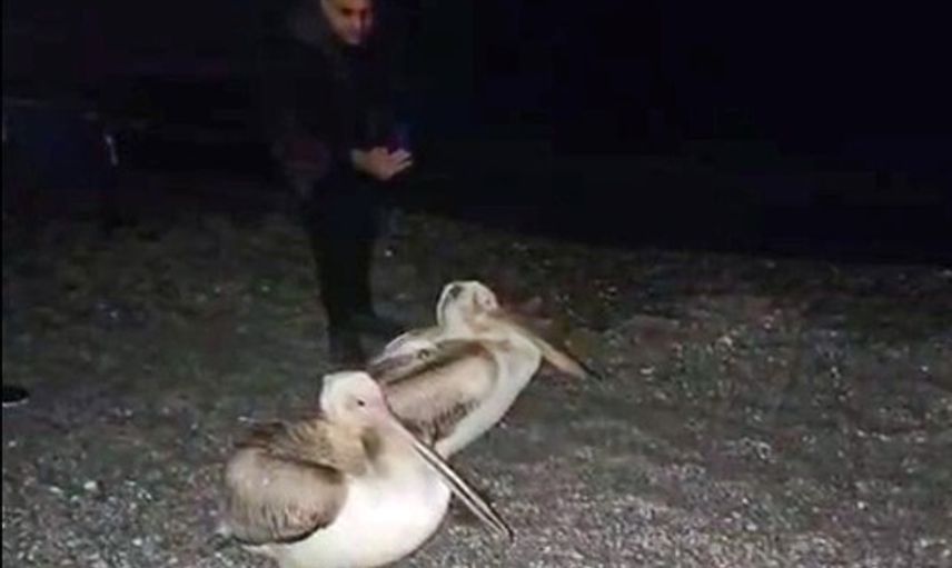 Antalya'nın dünyaca ünlü Konyaaltı Sahili'nde dün akşam saatlerinde sahile inen iki ak pelikan, çevrede bulunan vatandaşların dikkatini çekti. O anlar, sahilde bulunanlar tarafından cep telefonu kameralarıyla kayda alındı.