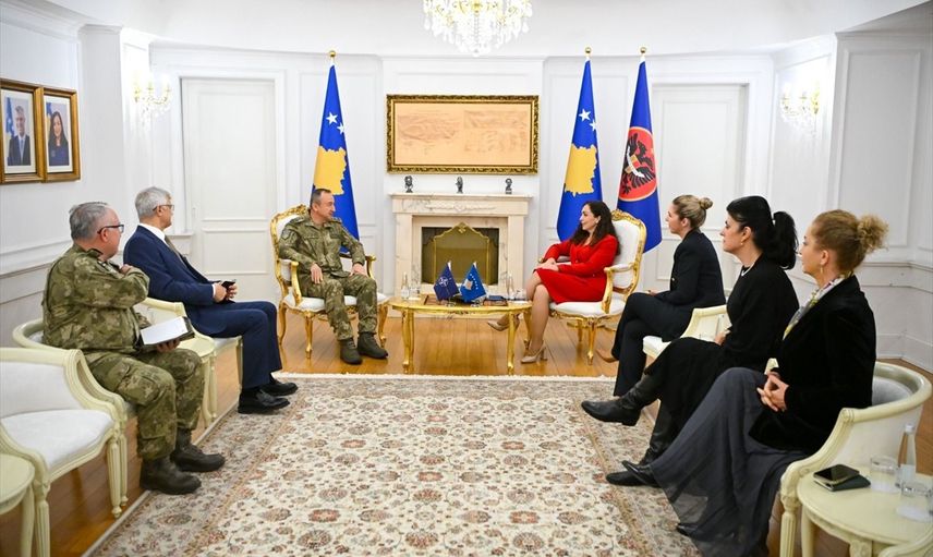 Kosova Cumhurbaşkanı Vjosa Osmani (sağ 4), NATO'nun Kosova'daki Barış Gücü’nün (KFOR) komutanlığını devralan Tümgeneral Özkan Ulutaş’ı (sol 3) kabul etti.