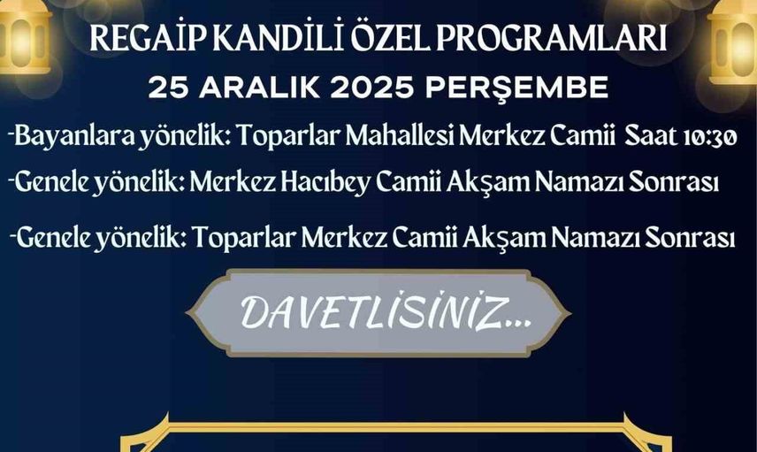 Köyceğiz Müftülüğü tarafından 25 Aralık 2025 Perşembe günü mübarek üç ayların ilk kandili olan Regaip Kandili anısına özel çalışmalar planlandı. Perşembe günü saat 10.30'da Toparlar Mahallesi Merkez Camii'nde kadınlara özel bir kandil programı gerçekleştirilecek.