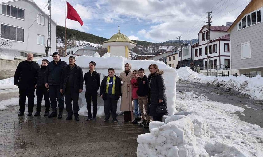 Köy meydanında kardan Sivas Valiliği maketi ilgi görüyor