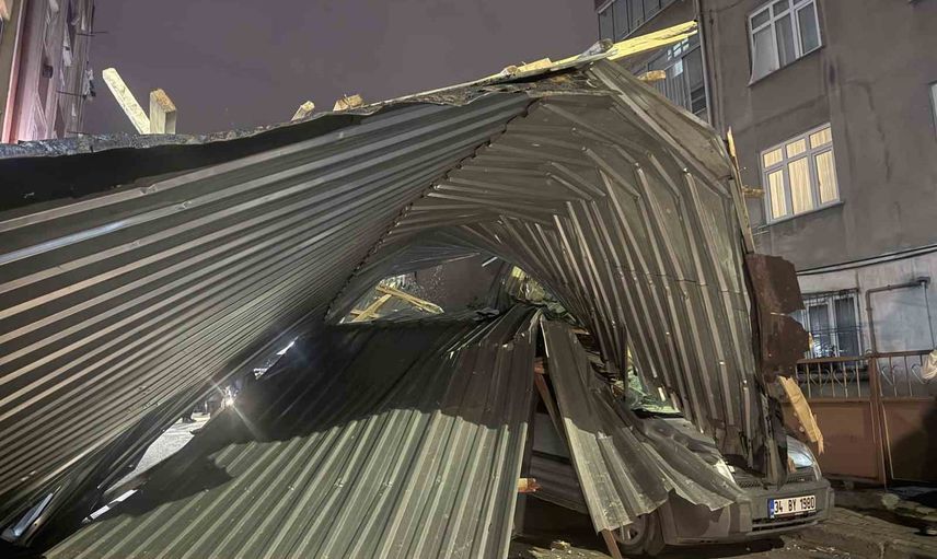 Küçükçekmece Mehmet Akif Mahallesi Çam Sokak'ta etkili olan şiddetli rüzgar, 5 katlı bir binanın çatısını yerinden kopardı. Savrulan çatı önce karşı binanın çatısına, ardından sokaktaki park halindeki araçların üzerine düştü.