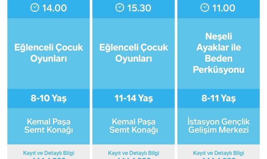 Kültür, Sanat ve Sosyal İşler Müdürlüğü tarafından düzenlenen etkinlikler; Sefaköy, Cennet ve Atakent Kültür ve Sanat Merkezi, Kuşlu Çocuk ve Rıfat Ilgaz Kütüphanesi, İstasyon Gençlik Gelişim Merkezi, Kemal Paşa Semt Konağı ve Güzel Sanatlar Akademisinde gerçekleştirilecek. 5-18 yaş arası çocuklara yönelik atölyeler, çocuk sinemaları, beden perküsyonu ve eğlenceli oyun aktiviteleri programda yer alıyor.