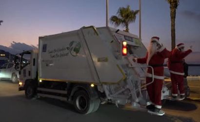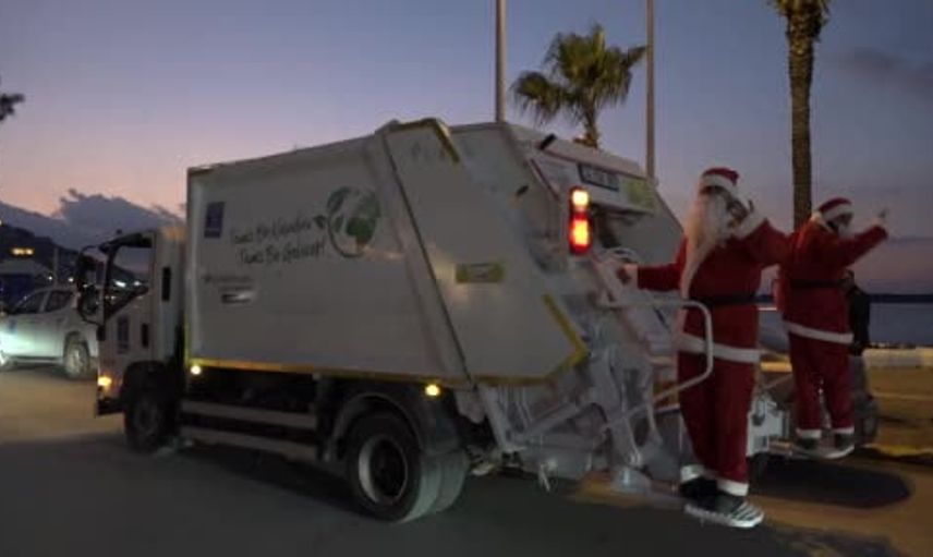 KUŞADASI BELEDİYESİ, YENİ YIL ÖNCESİ ÇEVRE TEMİZLİĞİNE DİKKAT ÇEKMEK İÇİN ÇÖP KAMYONLARINI IŞIKLARLA SÜSLERKEN, NOEL BABA KOSTÜMÜ GİYEN PERSONELER İSE HEM ÇOCUKLARIN YÜZÜNÜ GÜLDÜRDÜ HEM DE ÇEVRE BİLİNCİ MESAJI VERDİ.