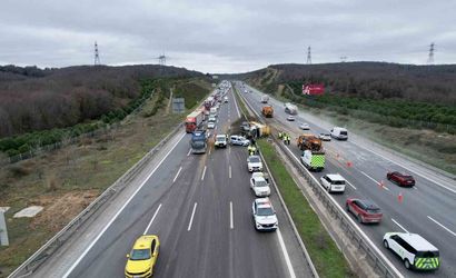 İSTANBUL’UN ARNAVUTKÖY İLÇESİ’NDE KUZEY MARMARA OTOYOLU’NUN FENERTEPE GİŞELERİ MEVKİİNDE SÜRÜCÜSÜNÜN KONTROLÜNDEN ÇIKAN HAFRİYAT KAMYONU YAN YATTI. KAZA NEDENİYLE OTOYOLUN ANKARA VE İSTANBUL İSTİKAMETLERİNDE ÇOK SAYIDA ŞERİT TRAFİĞE KAPATILIRKEN, OLUŞAN TRAFİK YOĞUNLUĞU HAVADAN GÖRÜNTÜLENDİ.