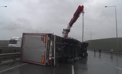 Kuzey Marmara Otoyolu'nun Kocaeli kesiminde gece saatlerinden itibaren etkili olan şiddetli fırtına, otoyolun Dilovası geçişinde seyir halindeki iki tırın devrilmesine yol açtı.