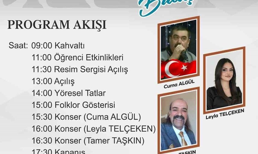 Gün boyunca öğrenci etkinlikleri, resim sergisi, resmi açılış, yöresel tatlar ve folklor gösterileri düzenlenecek. Ayrıca sahnede konser verecek isimler arasında Cuma Algül, Leyla Telçeken ve Tamer Taşkın bulunuyor.