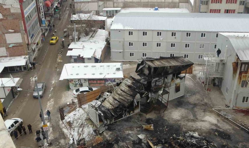Malatya'da şantiyedeki prefabrik yatakhane yangını gündüz görüntülendi