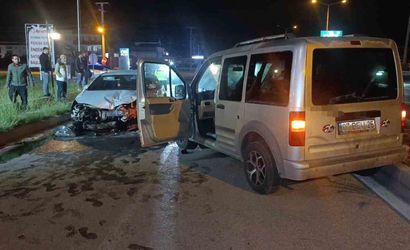 Antalya’nın Manavgat ilçesinde D-400 kara yolunda seyir halindeyken refüj ve trafik tabelasına çarpan bir otomobil, havalanarak yan yoldan gelen hafif ticari araca çarptı.