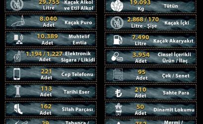 Silah, patlayıcı ve diğer kaçak eşyalar: 29 adet ruhsatsız tabanca ve av tüfeği, 162 silah parçası, 752 mermi, 50 adet dinamit lokumu, 113 adet tarihi eser, 221 kaçak cep telefonu, 3 bin 954 cinsel içerikli ürün, 7 bin 490 litre kaçak akaryakıt, 210 adet sahte para ile 95 adet çek ve senet.