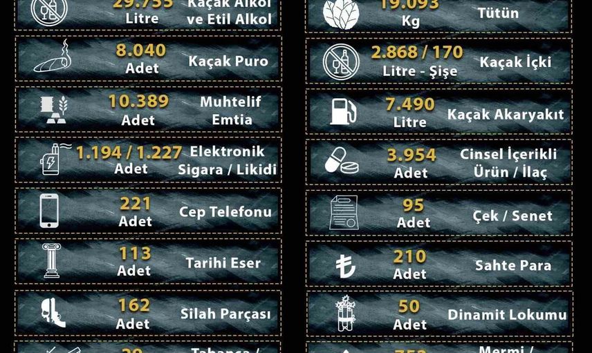 Tütün ve tütün mamulleri: 24 milyon 801 bin 242 adet kaçak makaron, 34 bin 540 paket kaçak sigara, 19 bin 93 kilogram tütün ve nargile tütünü, 8 bin 40 adet puro, bin 194 adet elektronik sigara ve bin 227 adet likit.