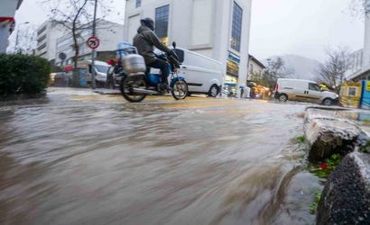 Sokaklar ve caddeler yağmurla birlikte adeta dere yatağına döndü; vatandaşlar kaldırım ve cadde arasında geçişte güçlük çekerken, birçok iş yerinin önünde su birikintileri oluştu. Esnaf, iş yerlerine su girmesini engellemek için kapı önlerindeki suları çekti ve çareyi çantaları bağlamakta buldu.