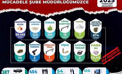 Bu kişilerden 54 kişi tutuklanırken, aranan 106 şahıs da yakalandı. Operasyonlarda ele geçirilenler arasında; 68 bin 492 sentetik ecza (hap), 503 gram sentetik kannabinoid (bonzai), 395 gram esrar, 171 gram sentetik kannabinoid hammaddesi, 123 gram metamfetamin, 76 gram skank ve 7 gram kokain yer aldı.