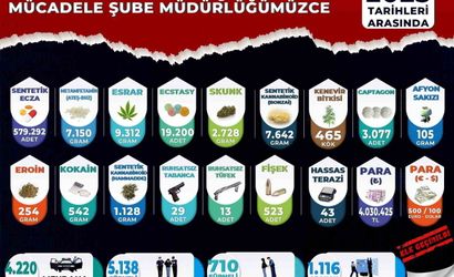 579 bin 292 adet sentetik ecza, 19 bin 200 adet ecstasy, 3 bin 77 adet captagon, 9 kilo 312 gram esrar, 7 kilo 642 gram bonzai (sentetik kannabinoid), 7 kilo 150 gram metamfetamin, 2 kilo 728 gram skank, 1 kilo 128 gram bonzai hammaddesi, 542 gram kokain, 254 gram eroin, 105 gram afyon sakızı ve 465 kök kenevir bitkisi.