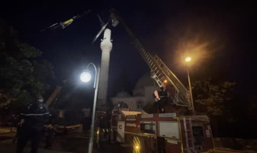 Camiden yapılan anonslarla vatandaşlara "dikkatli olun" uyarısı yapıldı. Belediye ekipleri ve itfaiye, geniş güvenlik önlemleri eşliğinde külahı sökmek için çalışmaya başladı; külahın tamir edilip tekrar yerine takılacağı öğrenildi.
