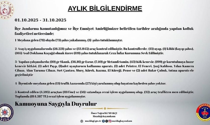 Mardin’in Mazıdağı ilçesinde Jandarma Komutanlığı ve İlçe Emniyet Amirliği tarafından 1-31 Ekim 2025 tarihleri arasında yürütülen kapsamlı kolluk çalışmaları rapor edildi. Ekim ayına ilişkin bilgilendirme İlçe Kaymakamlığı tarafından yayımlandı.