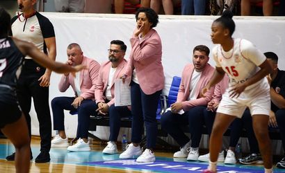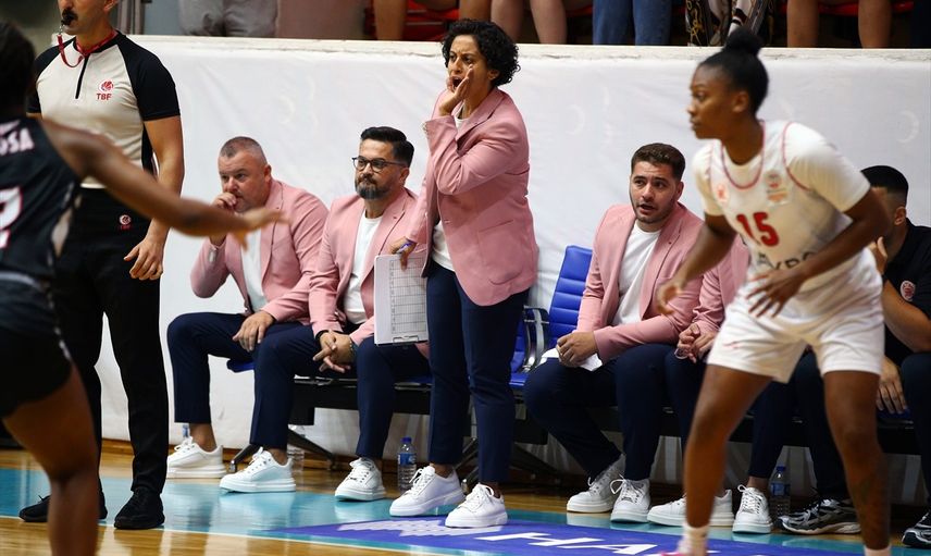 Halkbank Türkiye Kadınlar Basketbol Ligi ekiplerinden Adana Nova Basketbol'un teknik heyeti, meme kanserinde erken teşhisin önemine dikkati çekmek amacıyla iç saha maçlarında pembe ceket giyiyor. Başantrenör Ender Ünlü (ortada) oyuncularına taktik verdi.