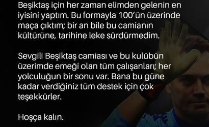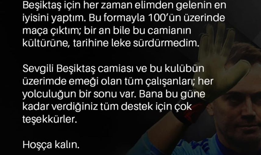 "15 Ağustos 2021. Beşiktaş’a imza attığım ilk gün... Yüzlerce antrenman, onlarca maç, galibiyetler, mağlubiyetler, sakatlıklar, geri dönüşler, şanslar, şanssızlıklar... Bir kalecinin yaşayabileceği her duyguyu yaşadım. Beşiktaş için her zaman elimden gelenin en iyisini yaptım. Bu formayla 100’ün üzerinde maça çıktım; bir an bile bu camianın kültürüne, tarihine leke sürdürmedim. Sevgili Beşiktaş camiası ve bu kulübün üzerimde emeği olan tüm çalışanları; her yolculuğun bir sonu var. Bana bu güne kadar verdiğiniz tüm destek için çok teşekkürler. Hoşça kalın."
