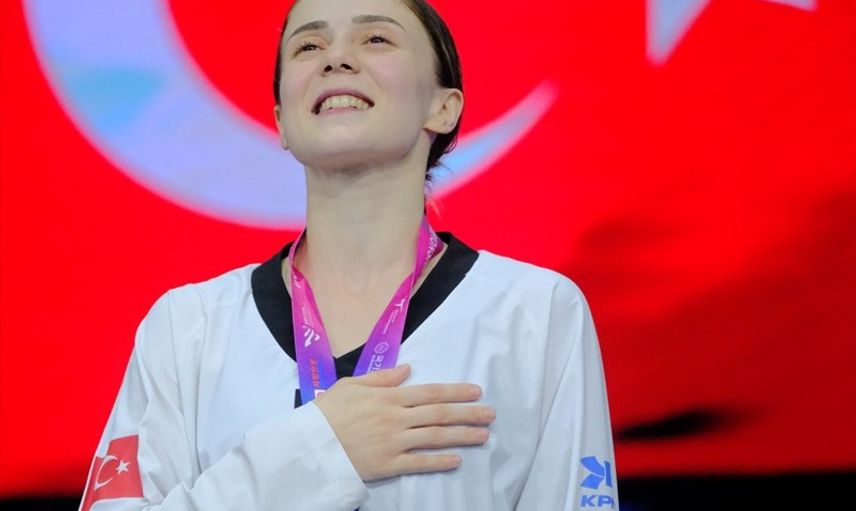 Milli sporcu Merve Dinçel Kavurat (solda), Çin'de düzenlenen Dünya Tekvando Şampiyonası'nda altın madalya kazandı.