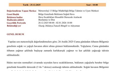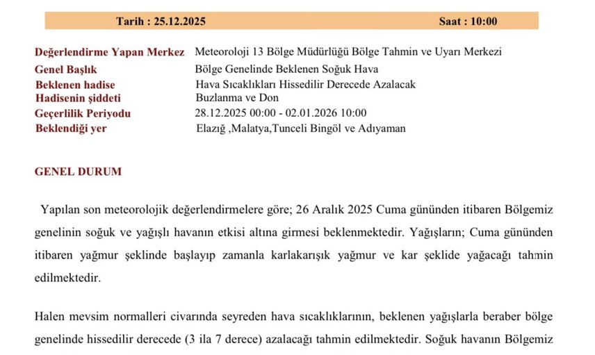 Meteoroloji 13. Bölge Müdürlüğü, Elazığ, Tunceli, Malatya, Bingöl ve Adıyaman için uyarıda bulundu.