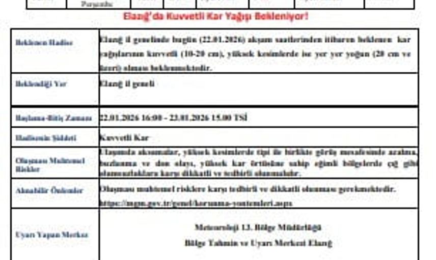 Meteoroloji 13. Bölge Müdürlüğü tarafından yapılan açıklamada, 22.01.2026 akşam saatlerinden itibaren Elazığ genelinde beklenen kar yağışlarının 10-20 cm arasında kuvvetli olmasının, yüksek kesimlerde ise yer yer 20 cm ve üzeri yoğunlukta kar beklendiğinin altı çizildi.