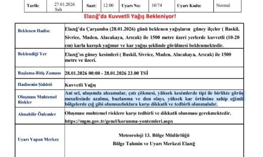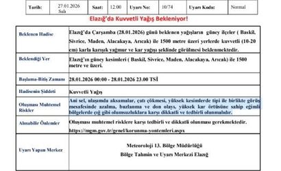 Açıklamada, Elazığ’ın güney ilçeleri (Baskil, Sivrice, Maden, Alacakaya, Arıcak) ile 1500 metre üzeri kesimlerde beklenen yağışların 10-20 cm aralığında karla karışık yağmur ve kar şeklinde görüleceği belirtildi.